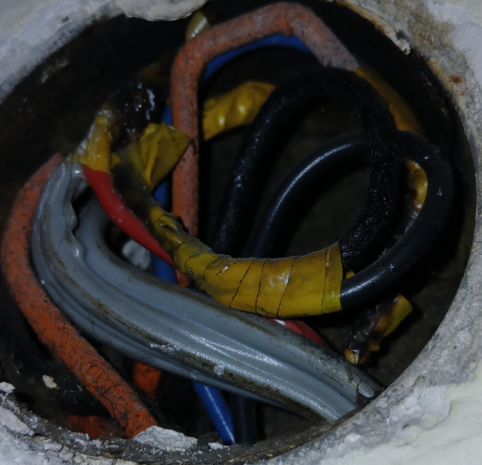 Hiányoznak a kötődobozok fedelei, láthatóan maradtak a színjelölt, egyszeresen szigetelt vezetékek. A sérülésük esetén könnyen megérinthetők a feszültség alatt álló vezetékszakaszok.