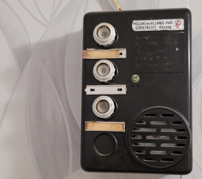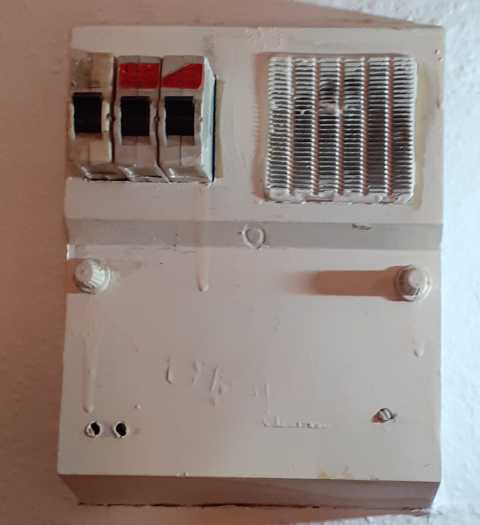Elavult, olvadóbiztosítókkal szerelt lakáselosztó, mely a funkcióját nem látja már el.