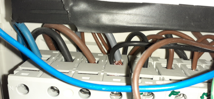 Viszonylag új szerelés, de a sodrott vezetékekről lemaradtak az érvéghüvelyek,