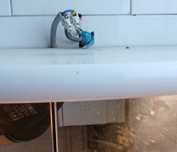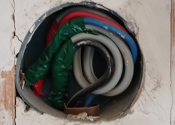 Lakáselosztó talált állapotban, a vezetékek szabadon hagyva, összesodorva.