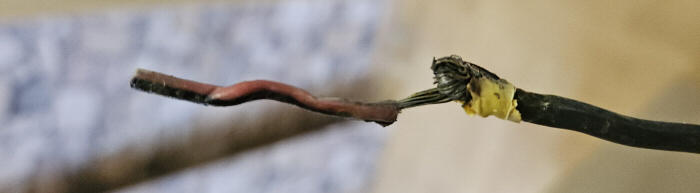 Összetekert és leforrasztott rézvezetékek leégett szigetelőszalaggal.