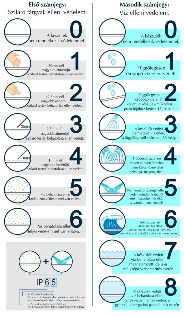 Egy IP20 védettségű lámpát például felrakhatunk egy zárt folyosó falára, de kültéren már nem lehet alkalmazni, mert az első zápor alkalmával beázna, és a por lerakódna benne. Egy IP68-as védelmű, víz alatti medencevilágító lámpát viszont kár lenne bárhol máshol használni, mert sem a folyosón, sem a kertben nincsen szükség ilyen nagyfokú védelemre.